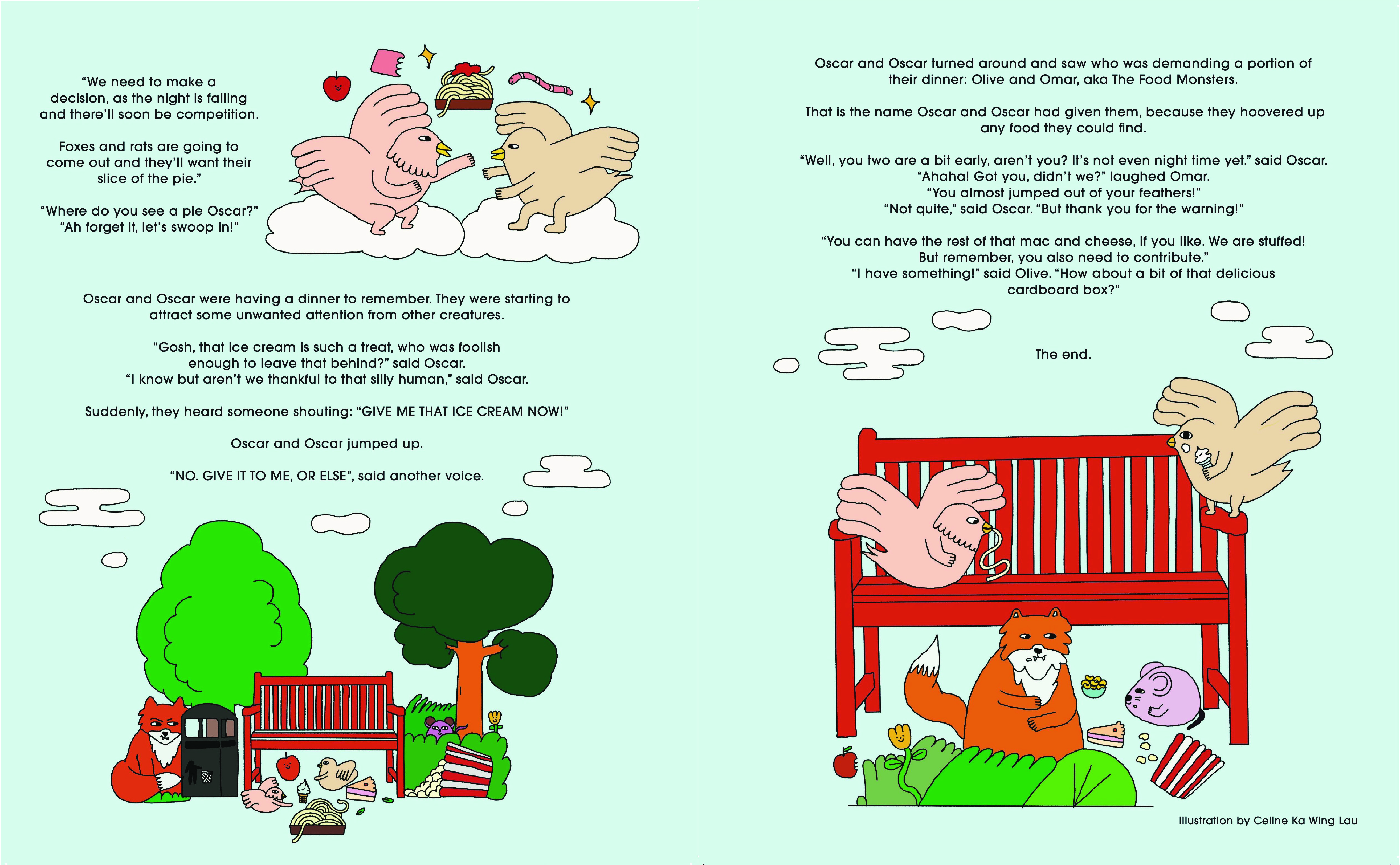 An Illustration on the story Oscar & Oscar, a journey of two bird having dinner.