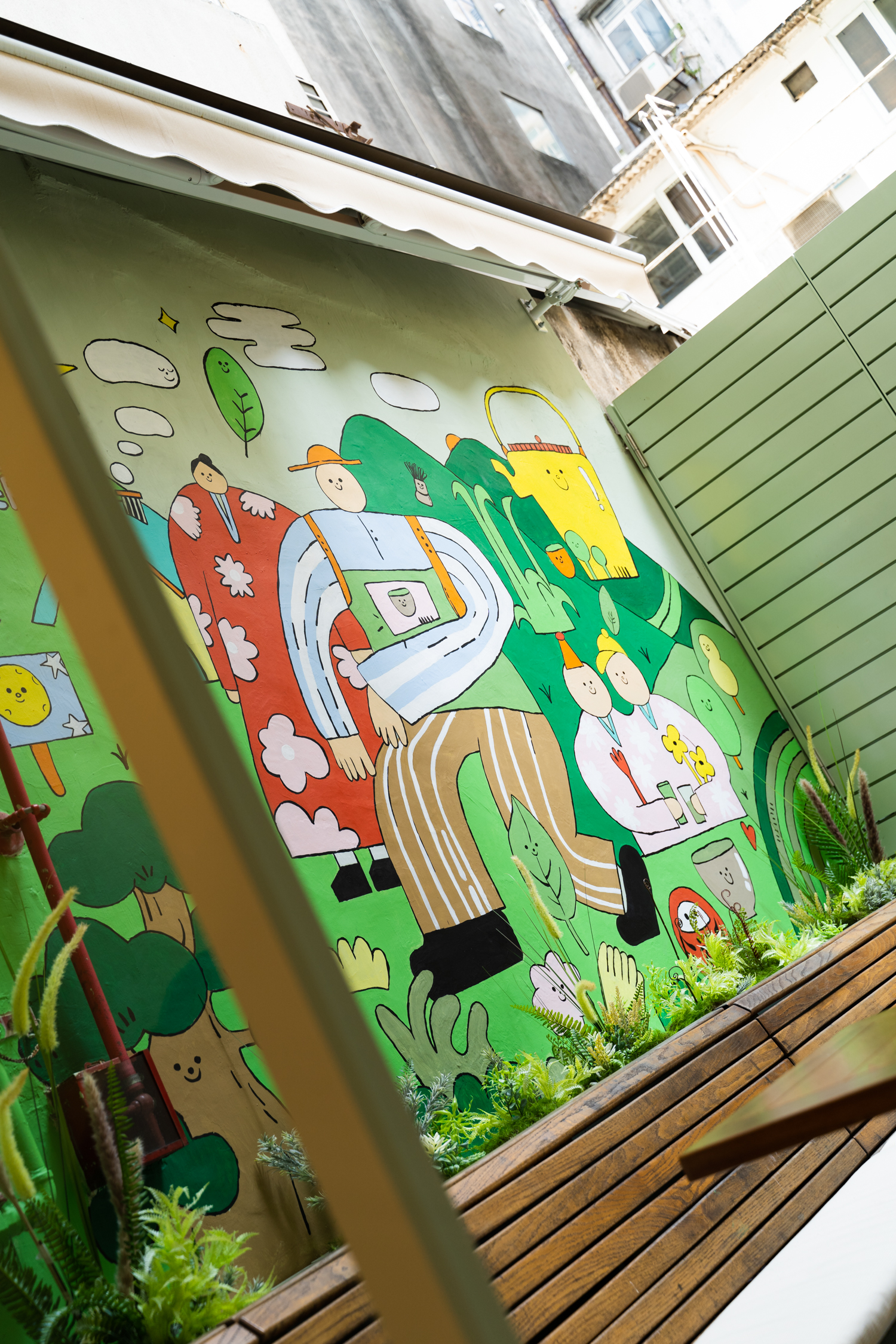 Matchali has always been known for a contemporary and chill vibe, yet their drinks are not only sensory stimulating but also visually appealing. For me to create a mural for them I have to not only match the atmosphere of the store but I wanted to enhance the feeling and illustrate the community that they have built. I wish I can fully translate that into a visual language and convey their identity which customers can get instantly when they lay their eyes on the work.